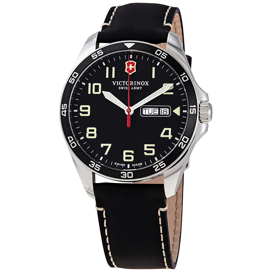 Stainless steel case with a black leather strap. Uni-directional rotating stainless steel bezel with a balck aluminium ring. Black dial with luminous silver-tone hands and Arabic numeral hour markers. Minute markers around the outer rim. Dial Type: Analog. Luminescent hands and markers. Day of the week and date display at the 3 o'clock position. Quartz movement. Scratch resistant sapphire crystal. Push / pull crown. Solid case back. Round case shape. Case size: 42 mm. Case thickness: 11 mm. Band width: 21 mm. Tang clasp. Water resistant at 100 meters / 330 feet. Functions: date, day, hour, minute, second. Casual watch style. Watch label: Swiss Made. Victorinox Fieldforce Quartz Black Dial Mens Watch 241846.