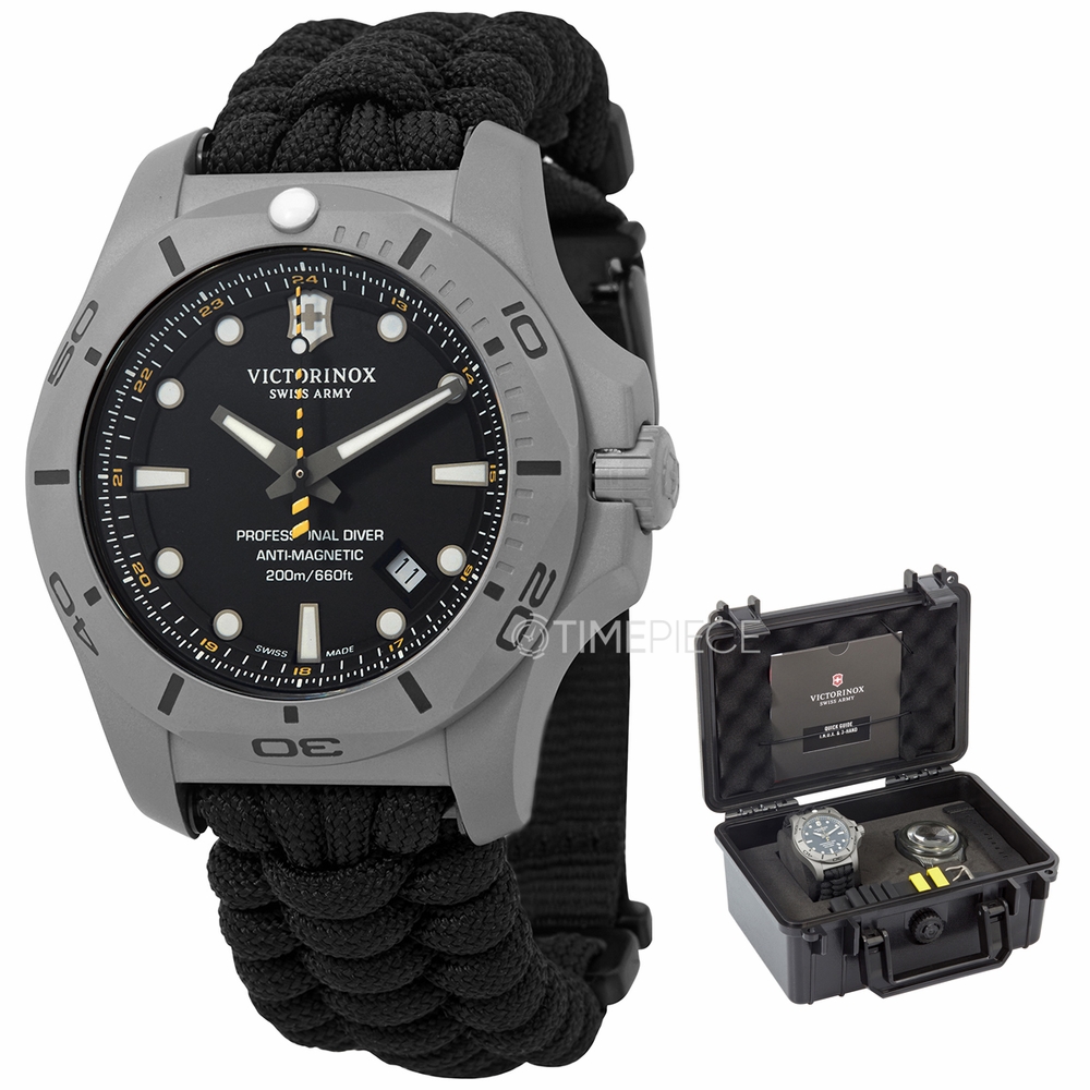 Grey titanium case with a black textile strap. Uni-directional rotating grey titanium bezel. Black dial with luminous grey hands and dot hour markers. 24 hour markers. Minute markers around the outer rim. Dial Type: Analog. Luminescent hands and markers. Date display between the 4 and 5 o'clock positions. Quartz movement. Scratch resistant sapphire crystal. Screw down crown. Solid case back. Round case shape. Case size: 42 mm. Case thickness: 14.4 mm. Band width: 22 mm. Tang clasp. Water resistant at 200 meters / 660 feet. Functions: date, hour, minute, second. I.n.o.x. Professional Diver Series. Sport watch style. Victorinox I.N.O.X. Professional Diver Quartz Black Dial Mens Watch 241812.2.