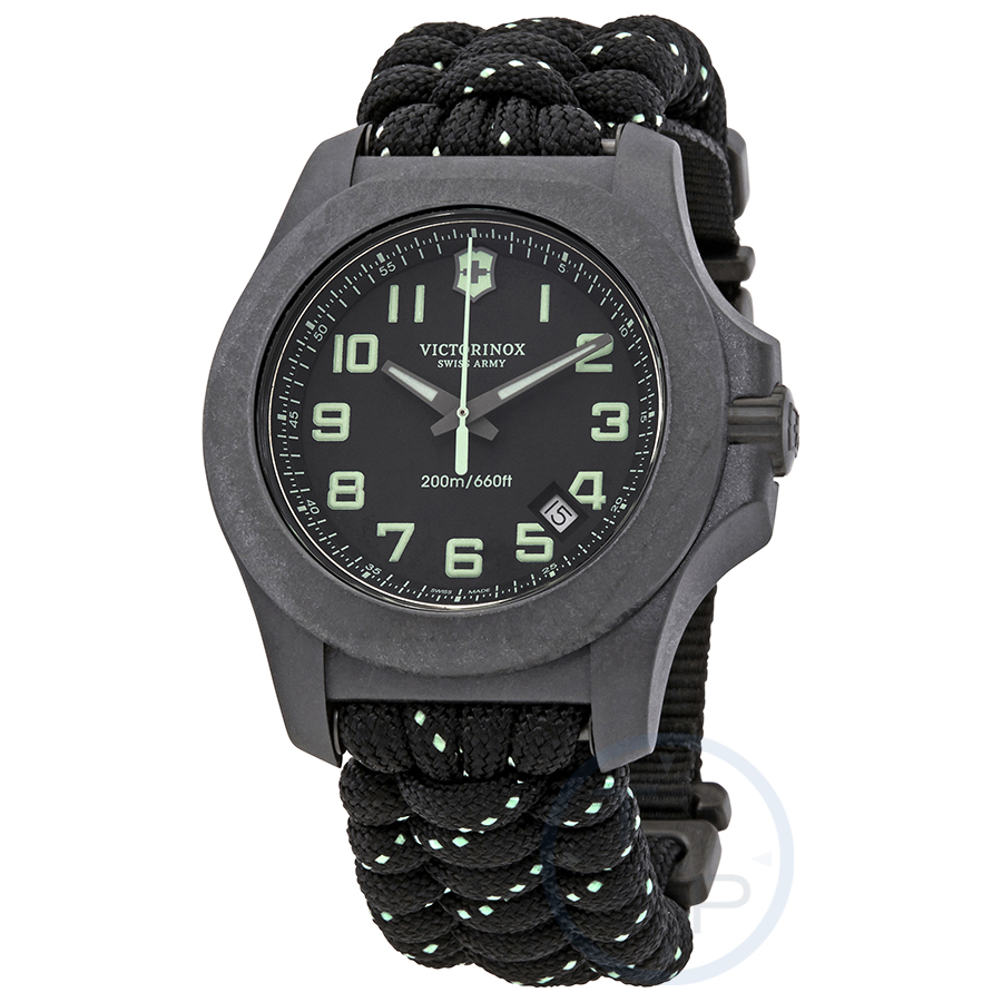 Black carbon case with a black textile paracord strap. Fixed black carbon bezel. Black dial with luminous gunmetal hands and Arabic numeral hour markers. Minute markers around the outer rim. Dial Type: Analog. Luminescent hands and markers. Date display between the 4 and 5 o'clock positions. Quartz movement. Scratch resistant sapphire crystal. Screw down crown. Solid case back. Round case shape. Case size: 43 mm. Case thickness: 13 mm. Band width: 21 mm. Tang clasp. Water resistant at 200 meters / 660 feet. Functions: date, hour, minute, second. Casual watch style. Watch label: Swiss Movt. Victorinox I.N.O.X. Quartz Black Dial Mens Watch 241859.