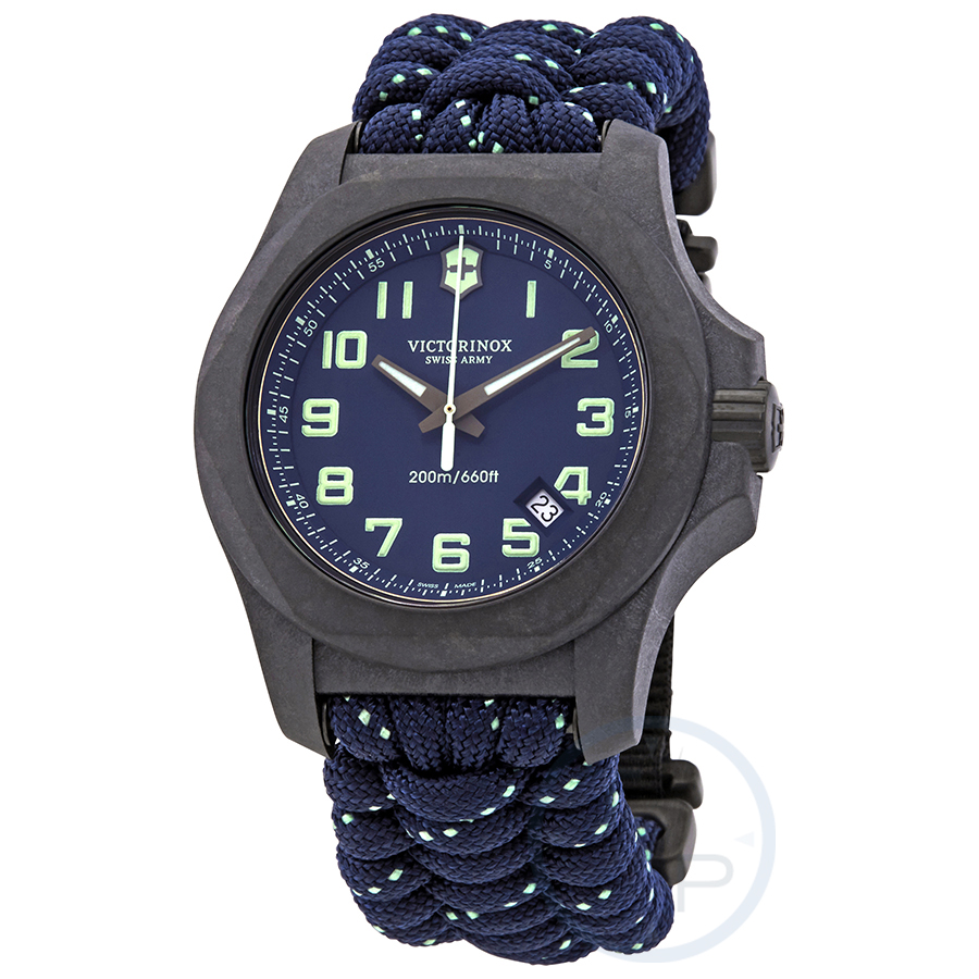 Black carbon case with a blue textile paracord strap. Fixed black carbon bezel. Blue dial with luminous gunmetal hands and Arabic numeral hour markers. Arabic Numeral Minute Markers (at 5 minute intervals). Minute markers around the outer rim. Dial Type: Analog. Luminescent hands and markers. Date display between the 4 and 5 o'clock positions. Quartz movement. Scratch resistant sapphire crystal. Screw down crown. Solid case back. Round case shape. Case size: 43 mm. Case thickness: 13 mm. Band width: 21 mm. Tang clasp. Water resistant at 200 meters / 660 feet. Functions: date, hour, minute, second. Casual watch style. Watch label: Swiss Movt. Victorinox I.N.O.X. Carbon Blue Dial Mens Watch 241860.