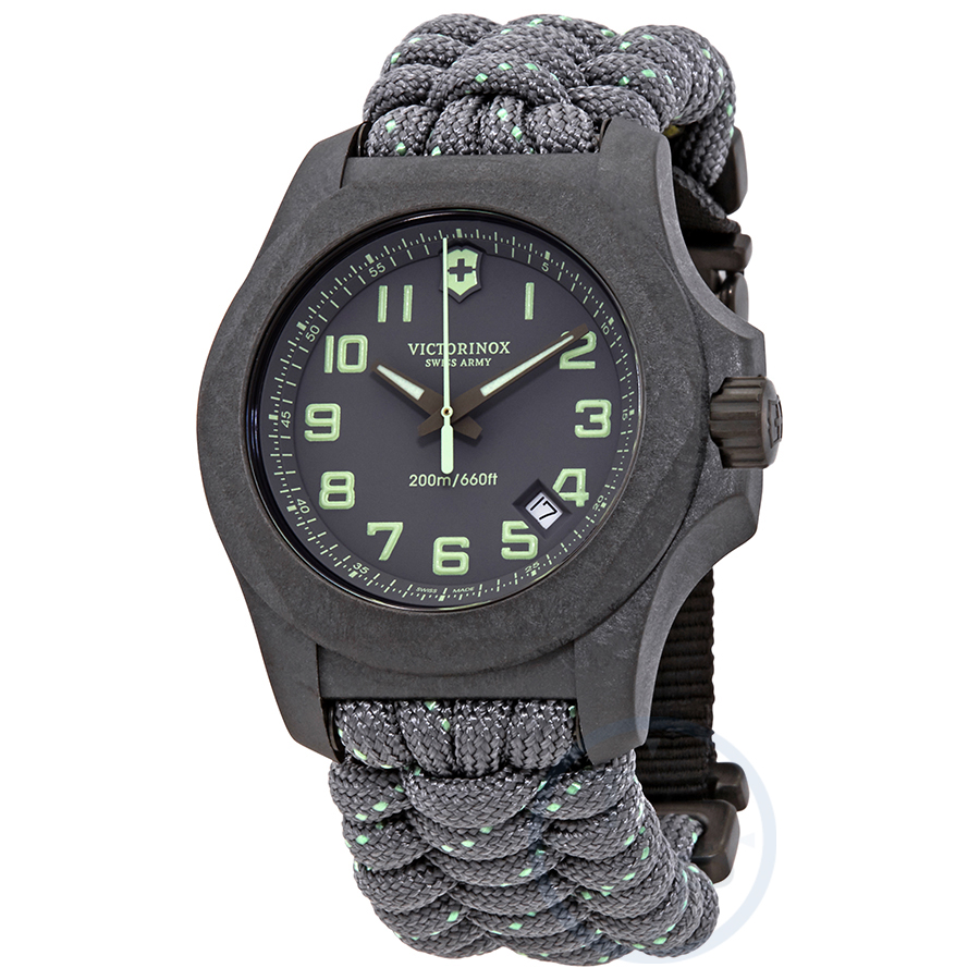 Grey carbon case with a grey textile paracord strap. Fixed grey carbon bezel. Grey dial with luminous grey hands and Arabic numeral hour markers. Minute markers around the outer rim. Dial Type: Analog. Luminescent hands and markers. Date display between the 4 and 5 o'clock positions. Quartz movement. Scratch resistant sapphire crystal. Screw down crown. Solid case back. Round case shape. Case size: 43 mm. Case thickness: 13 mm. Band width: 21 mm. Tang clasp. Water resistant at 200 meters / 660 feet. Functions: date, hour, minute, second. Casual watch style. Watch label: Swiss Movt. Victorinox I.N.O.X. Quartz Grey Dial Mens Watch 241861.