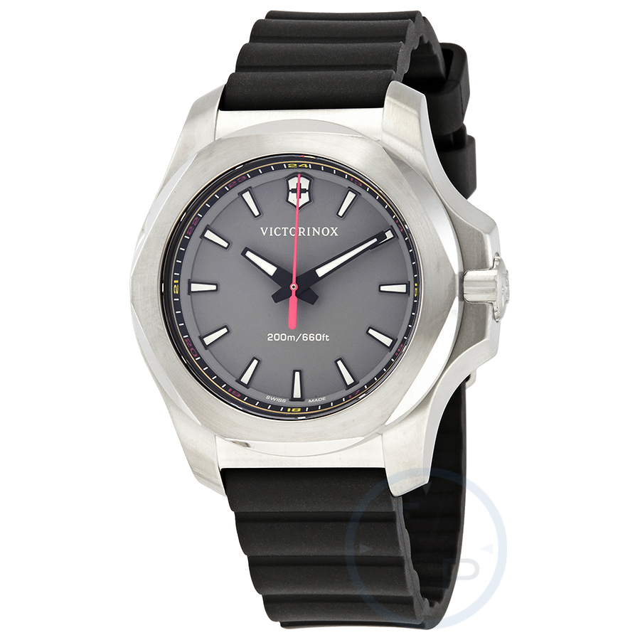 Stainless steel case with a black rubber strap. Fixed stainless steel bezel. Grey dial with luminous black hands and index hour markers. Minute markers around the outer rim. Dial Type: Analog. Luminescent hands and markers. Quartz movement. Scratch resistant sapphire crystal. Screw down crown. Solid case back. Round case shape. Case size: 37 mm. Case thickness: 14 mm. Band width: 18 mm. Tang clasp. Water resistant at 200 meters / 660 feet. Functions: hour, minute, second. I.n.o.x. Series. Military watch style. Watch label: Swiss Made. Victorinox I.N.O.X. Quartz Grey Dial Black Rubber Mens Watch 241881.