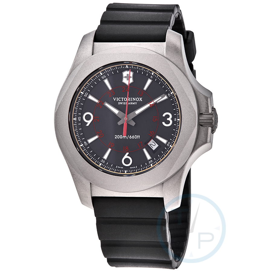Grey titanium case with a black rubber strap. Fixed grey titanium bezel. Grey dial with silver-tone hands and Arabic numeral and index hour markers. Minute markers around the outer rim. Dial Type: Analog. Luminescent hands and markers. Date display between 4 and 5 o'clock position. Quartz movement. Scratch resistant sapphire crystal. Screw down crown. Solid case back. Round case shape. Case size: 43 mm. Buckle clasp. Water resistant at 200 meters / 660 feet. Functions: date, hour, minute, second. Additional Info: includes a removable compass bumper for anti-scratch protection. Military watch style. Watch label: Swiss Made. Victorinox I.N.O.X. Quartz Grey Dial Mens Watch 241883.