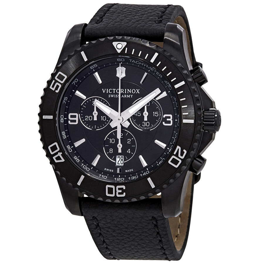 Black PVD stainless steel case with a black leather strap. Uni-directional rotating black PVD bezel. Black dial with luminous silver-tone hands and index hour markers. Arabic numerals mark the 3 and 9 o'clock positions. Minute markers. Tachymeter markings around the outer rim. Dial Type: Analog. Luminescent hands and markers. Date display at the 6 o'clock position. Chronograph - three sub-dials displaying: 60 second, 30 minute and 12 hour. Quartz movement. Scratch resistant sapphire crystal. Pull / push crown. Solid case back. Round case shape, case size: 43 mm, case thickness: 12.2 mm. Tang clasp. Water resistant at 100 meters / 330 feet. Functions: chronograph, tachymeter, date, hour, minute, second. Military watch style. Watch label: Swiss Made. Victorinox Maverick Chronograph Black Dial Mens Watch 241786.