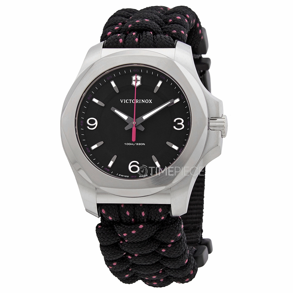 Black textile strap. Black dial with index-Arabic numeral markers at the 3, 6 and 9 o' clock positions hour markers. Minute markers around the outer rim. Dial Type: Analog. Luminescent hands and markers. Quartz movement. Scratch resistant sapphire crystal. Round case shape, case size: 37 mm. Buckle clasp. Water resistant at 100 meters / 330 feet. Functions: hour, minute, second. Victorinox Quartz Black Dial Ladies Watch 241918.