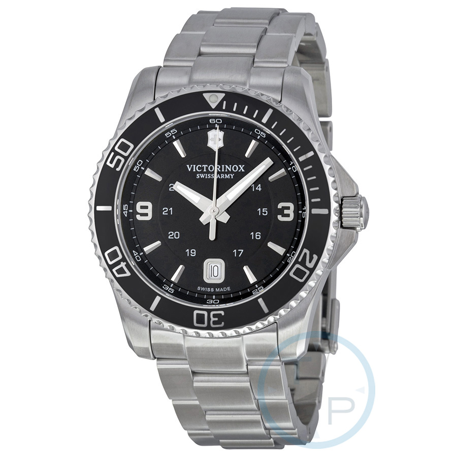 Silver-tone stainless steel case with a silver-tone stainless steel bracelet. Uni-directional rotating silver-tone stainless steel with black top ring bezel. Black dial with luminous silver-tone hands and index hour markers. Arabic numerals mark the 3 and 9 o'clock positions. 24 hour markers. minute markers around the outer rim. Dial Type: Analog. Luminescent hands and markers. Date display at the 6 o'clock position. Quartz movement. Scratch resistant sapphire crystal. Protected crown. Solid case back. Case size: 43 mm. Case thickness: 12.2 mm. Round case shape. Band width: 22 mm. Deployment with push button release clasp. Water resistant at 100 meters / 330 feet. Functions: date, hour, minute, second, 24 hour. Dress watch style. Watch label: Swiss Made. Victorinox Swiss Army Maverick Black Dial Mens Watch 241697.