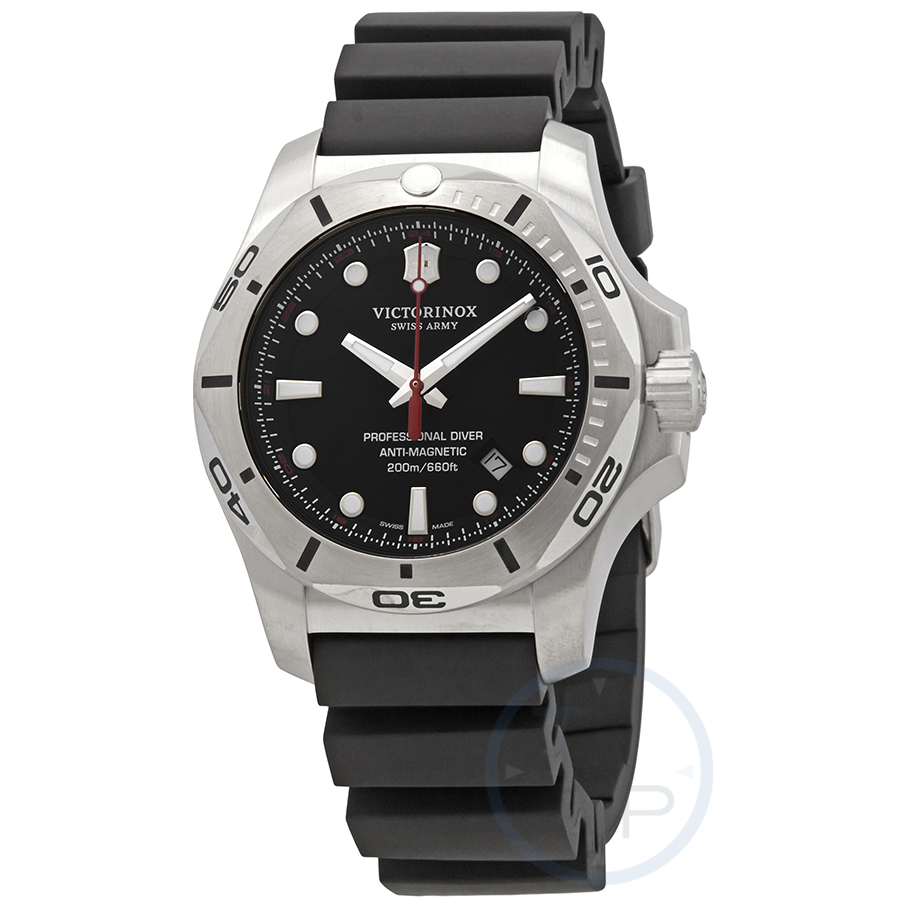 Stainless steel case with a black rubber strap. Uni-directional rotating stainless steel bezel. Black dial with silver-tone hands and dot hour markers. 24 hour (miltary time) scale. minute markers. Dial Type: Analog. Luminescent hands and markers. Date display between the 4 and 5 o'clock positions. Quartz movement. Scratch resistant sapphire crystal. Screw down crown. Solid case back. Round case shape. Case size: 45 mm. Case thickness: 13.85 mm. Band width: 21 mm. Tang clasp. Water resistant at 200 meters / 660 feet. Functions: date, hour, minute, second, military time display. Additional Info: includes a case protector. Casual watch style. Watch label: Swiss Made. Victorinox I.N.O.X. Professional Diver Quartz Black Dial Mens Watch 241733.1.