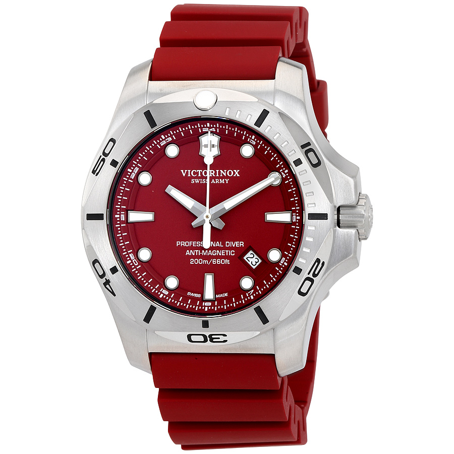 Stainless steel case with a red rubber strap. Uni-directional rotating stainless steel bezel. Red dial with luminous silver-tone hands and dot hour markers. 24 hour markers. Minute markers around the outer rim. Dial Type: Analog. Luminescent hands and markers. Date display between the 4 and 5 o'clock positions. Quartz movement. Scratch resistant sapphire crystal. Screw down crown. Solid case back. Case size: 45 mm. Case thickness: 15 mm. Round case shape. Band width: 21 mm. Tang clasp. Water resistant at 200 meters / 660 feet. Functions: chronograph, date, hour, minute, second. Sport watch style. Watch label: Swiss Made. Victorinox I.N.O.X. Professional Diver Red Dial Mens Watch 241736.