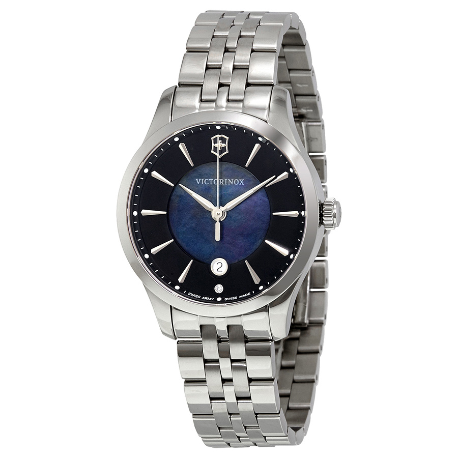 Stainless steel case with a stainless steel bracelet. Fixed stainless steel bezel. Black dial (with a black mother of pearl center) with silver-tone hands and index hour markers. A single diamond is set at the 6 o'clock position. Minute markers around the outer rim. Dial Type: Analog. Date display above the 6 o'clock position. Quartz movement. Scratch resistant sapphire crystal. Pull / push crown. Solid case back. Case size: 35 mm. Case thickness: 8 mm. Round case shape. Band width: 15 mm. Band length: 7 inches. Deployment clasp with a push button release. Water resistant at 100 meters / 330 feet. Functions: date, hour, minute, second. Casual watch style. Victorinox Alliance Small Black Dial Ladies Watch 241751.