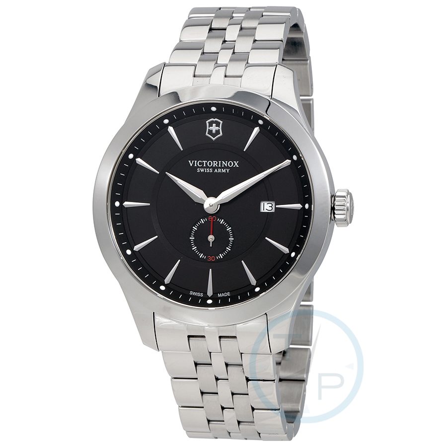 Silver-tone stainless steel case and bracelet. Fixed silver-tone bezel. Black dial with silver-tone hands and index hour markers. Minute markers around the outer rim. Dial Type: Analog. Luminescent hands and markers. Date display at the 3 o'clock position. Seconds sub-dial. Quartz movement. Scratch resistant sapphire crystal. Solid case back. Case size: 44 mm. Round case shape. Deployment clasp with a push button release. Water resistant at 100 meters / 330 feet. Functions: date, hour, minute, second, end of life indicator. Watch label: Swiss Made. Victorinox Alliance Black Dial Stainless Steel Mens Watch 241762.