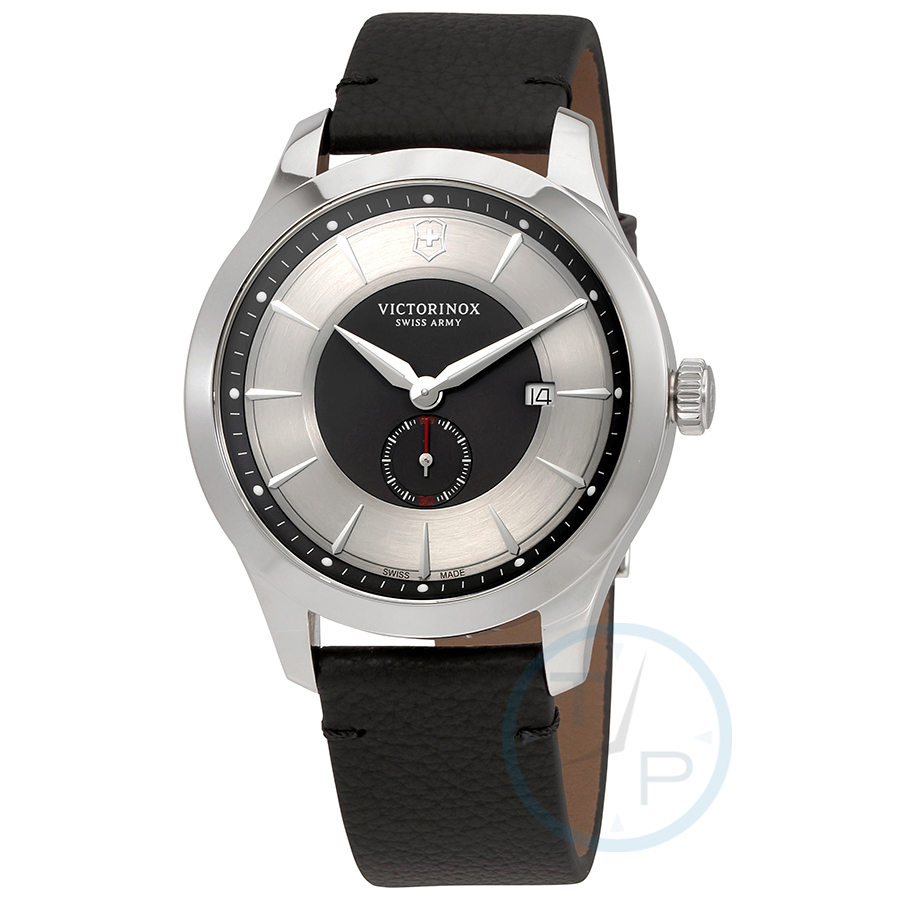 Stainless steel case with a black leather strap. Fixed stainless steel bezel. Grey dial with luminous silver-tone hands and index hour markers. Minute markers around the outer rim. Dial Type: Analog. Luminescent hands and markers. Date display at the 3 o'clock position. Small seconds sub-dial below center dial. Quartz movement. Scratch resistant sapphire crystal. Solid case back. Case size: 44 mm. Case thickness: 11 mm. Round case shape. Band width: 21 mm. Tang clasp. Water resistant at 100 meters / 330 feet. Functions: date, hour, minute, second. Watch label: Swiss Made. Victorinox Alliance Grey Dial Black Leather Mens Watch 241765.