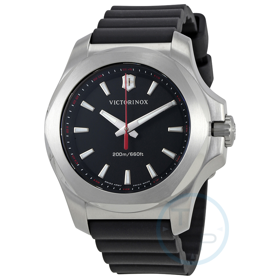 Silver-tone stainless steel case with a black rubber strap. Fixed silver-tone stainless steel bezel. Black dial with luminous silver-tone hands and index hour markers. 24 hour markers. Minute markers around the outer rim. Dial Type: Analog. Quartz movement. Scratch resistant sapphire crystal. Screw down crown. Solid case back. Case size: 37 mm. Round case shape. Band width: 18 mm. Tang clasp. Water resistant at 200 meters / 660 feet. Functions: hour, minute, second, end of life indicator. Casual watch style. Watch label: Swiss Made. Victorinox I.N.O.X. V Black Dial Black Rubber Ladies Watch 241768.