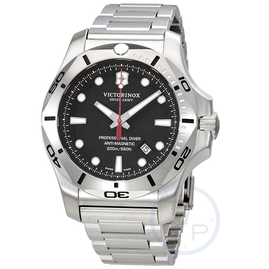Stainless steel case with a stainless steel bracelet. Uni-directional rotating stainless steel bezel. Black dial with luminous silver-tone hands and dot hour markers. 24 hour markers. Minute markers around the outer rim. Dial Type: Analog. Luminescent hands and markers. Date display between the 4 and 5 o'clock positions. Quartz movement. Scratch resistant sapphire crystal. Screw down crown. Solid case back. Round case shape. Case size: 45 mm. Case thickness: 15 mm. Band width: 21 mm. Fold over clasp with a safety release. Water resistant at 200 meters / 660 feet. Functions: date, hour, minute, second. I.N.O.X. Professional Diver Series. Casual watch style. Watch label: Swiss Made. Victorinox I.N.O.X. Professional Diver Black Dial Mens Watch 241781.