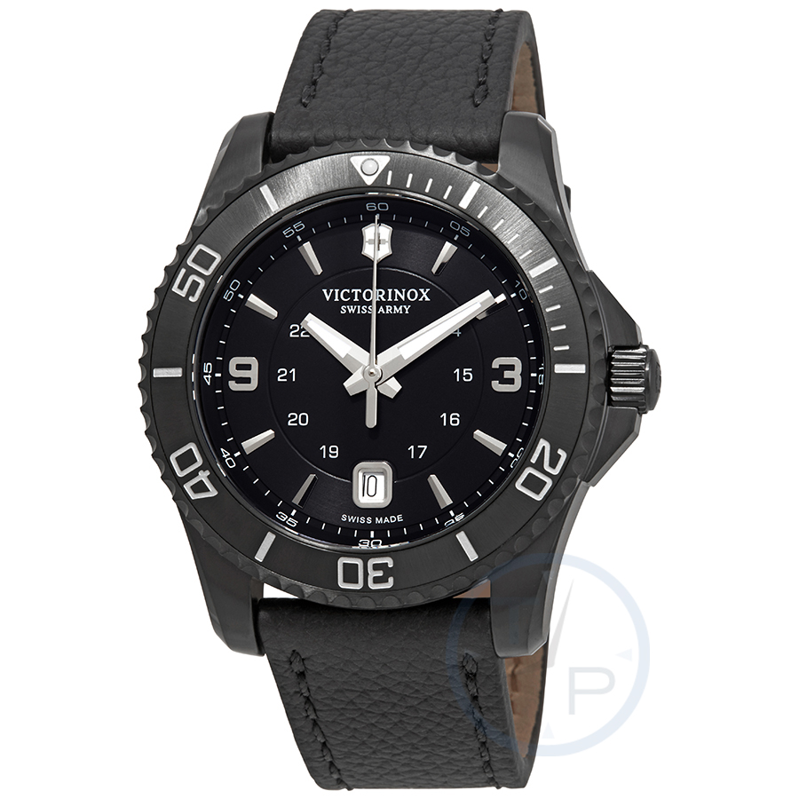 Black PVD stainless steel case with a black leather strap. Uni-directional rotating black PVD stainless steel bezel. Black dial with luminous silver-tone hands and index hour markers. Arabic numerals mark the 3 and 9 o'clock positions. minute markers around the outer rim. Dial Type: Analog. Luminescent hands and markers. Date display at the 6 o'clock position. Quartz movement. Scratch resistant sapphire crystal. Pull / push crown. Solid case back. Round case shape, case size: 43 mm, case thickness: 11.4 mm. Band width: 21 mm. Tang clasp. Water resistant at 100 meters / 330 feet. Functions: date, hour, minute, second, end-of-life indicator. Additional Info: in general, suitable for swimming and snorkeling, but not diving. Casual watch style. Watch label: Swiss Made. Victorinox Maverick Black Dial Black Leather Mens Watch 241787.