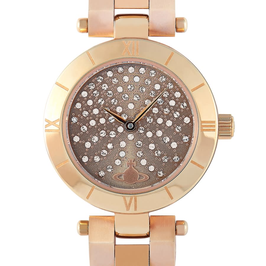 Rose gold PVD stainless steel case and bracelet. Fixed rose gold PVD bezel. Grey (crystal-set) dial with rose gold-tone hands. Dial Type: Analog. Quartz movement. Scratch resistant mineral crystal. Pull / push crown. Solid case back. Round case shape. Case size: 28 mm. Case thickness: 9 mm. Deployment clasp. Water resistant at 50 meters / 165 feet. Functions: hour, minute. Westbourne Series. Dress watch style. Vivienne Westwood Westbourne Quartz Grey Dial Ladies Watch VV092CHRS.
