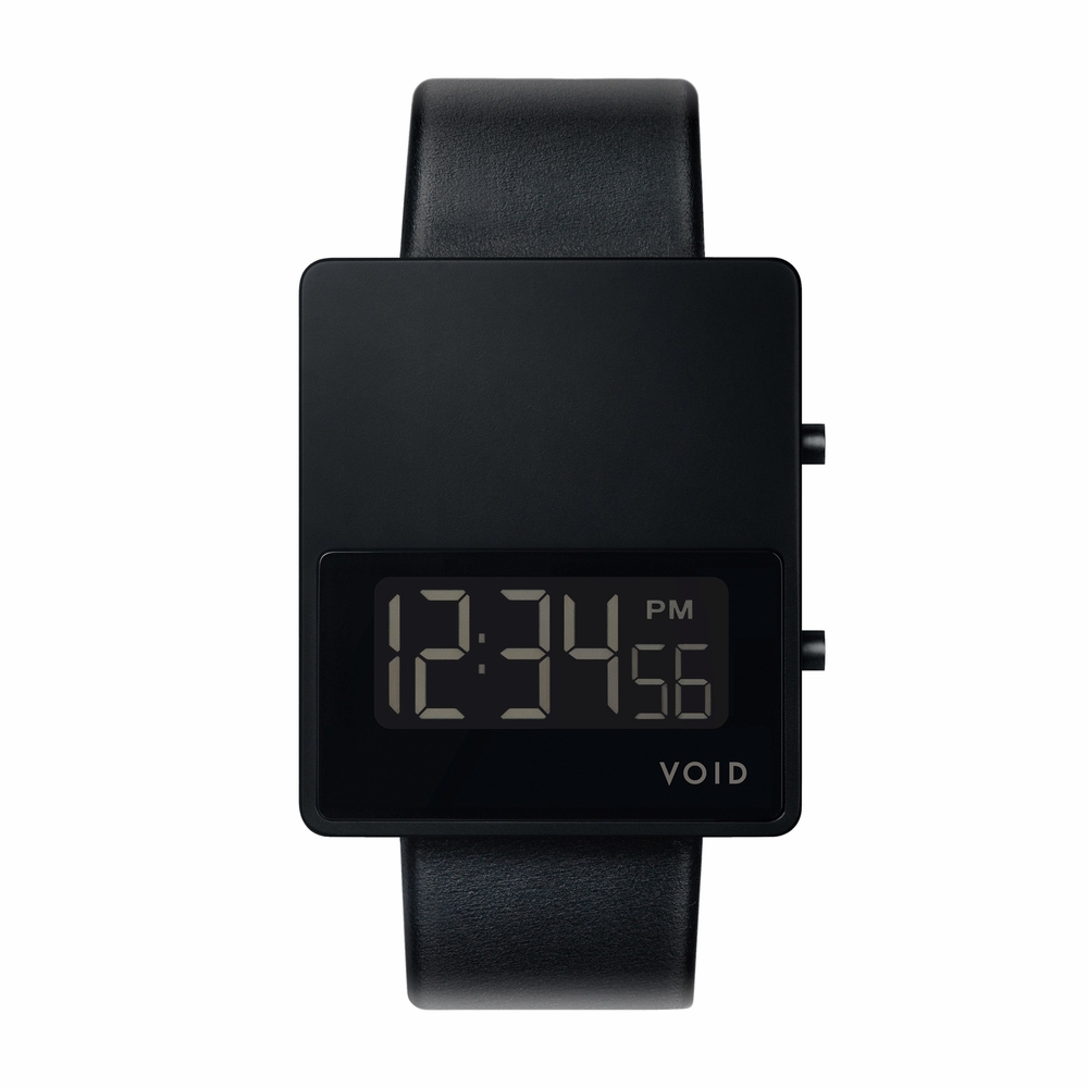 Black ion-plated 316 stainless steel case with a black (Italian) leather strap. Fixed black ion-plated bezel. Black digital dial showing hours, minutes, seconds, am/pm. Dial Type: digital. Quartz movement. Scratch resistant sapphire crystal. Pull / push crown. Solid case back. Rectangle case shape. Case dimensions: 36 mm x 42 mm. Band width: 22 mm. Tang clasp. Water resistant at 50 meters / 165 feet. Functions: hour, minute, second. Sport watch style. Void Watches Digital Watch V01MKII-BL/BL.
