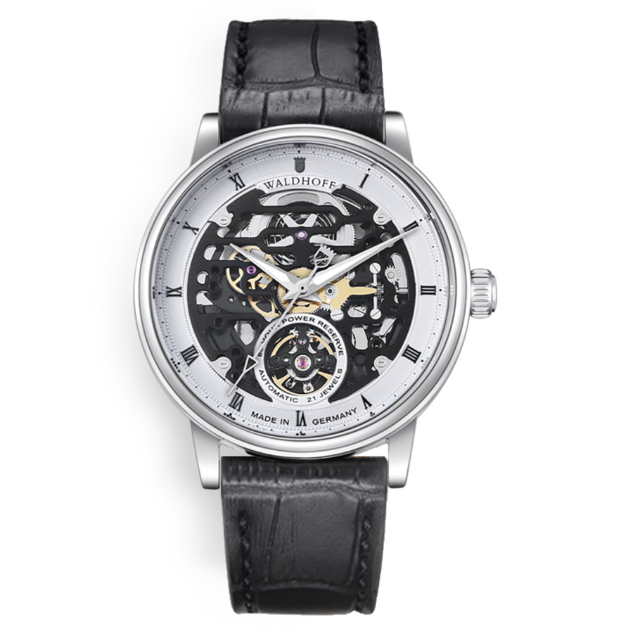 Silver-tone stainless steel case with a black leather strap. Fixed silver-tone stainless steel bezel. White dial with silver-tone hands and Roman numeral hour markers. Minute markers around the outer rim. Dial Type: Analog. Luminescent hands. HZ 7500 automatic movement. Scratch resistant sapphire crystal. Pull / push crown. Transparent case back. Round case shape, case size: 43 mm, case thickness: 11.8 mm. Band width: 22 mm. Buckle clasp. Water resistant at 30 meters / 100 feet. Functions: hour, minute, second. Capital Series. Dress watch style. Waldhoff Capital Automatic White Dial Mens Watch Waldhoff Capital Onyx Silver.
