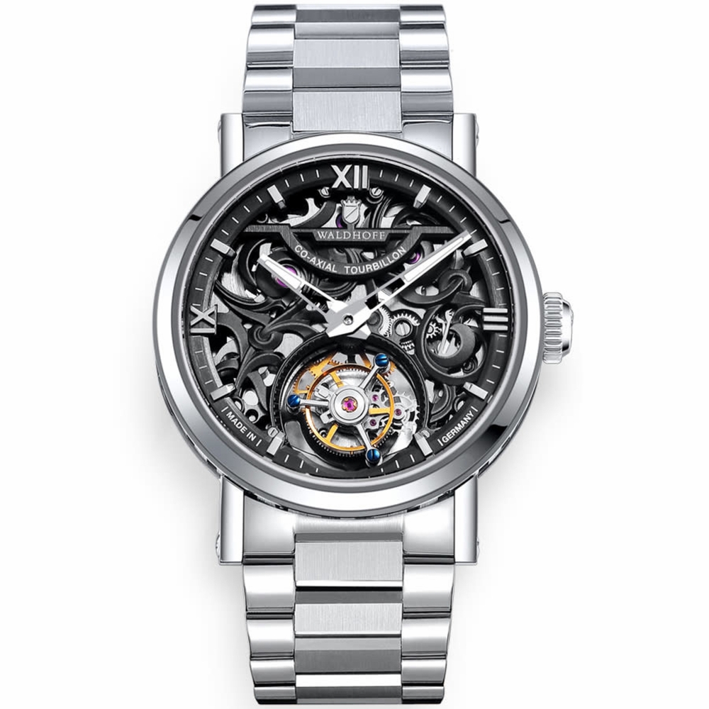 Metropolis Obsidian Black Tourbillon with steel bracelet Silver-tone stainless steel case and bracelet. Fixed silver-tone stainless steel bezel. Black dial with silver-tone hands and Roman numeral & index hour markers. Minute markers around the outer rim. Dial Type: Analog. Luminescent hands. HZ 3452 hand wind movement. Scratch resistant sapphire crystal. Pull / push crown. Transparent case back. Round case shape, case size: 41 mm, case thickness: 11 mm. Band width: 22 mm. Hidden clasp. Water resistant at 30 meters / 100 feet. Functions: tourbillon, hour, minute. Metropolis Series. Luxury watch style. Waldhoff Metropolis Tourbillon Hand Wind Black Dial Mens Watch MW-18BL.