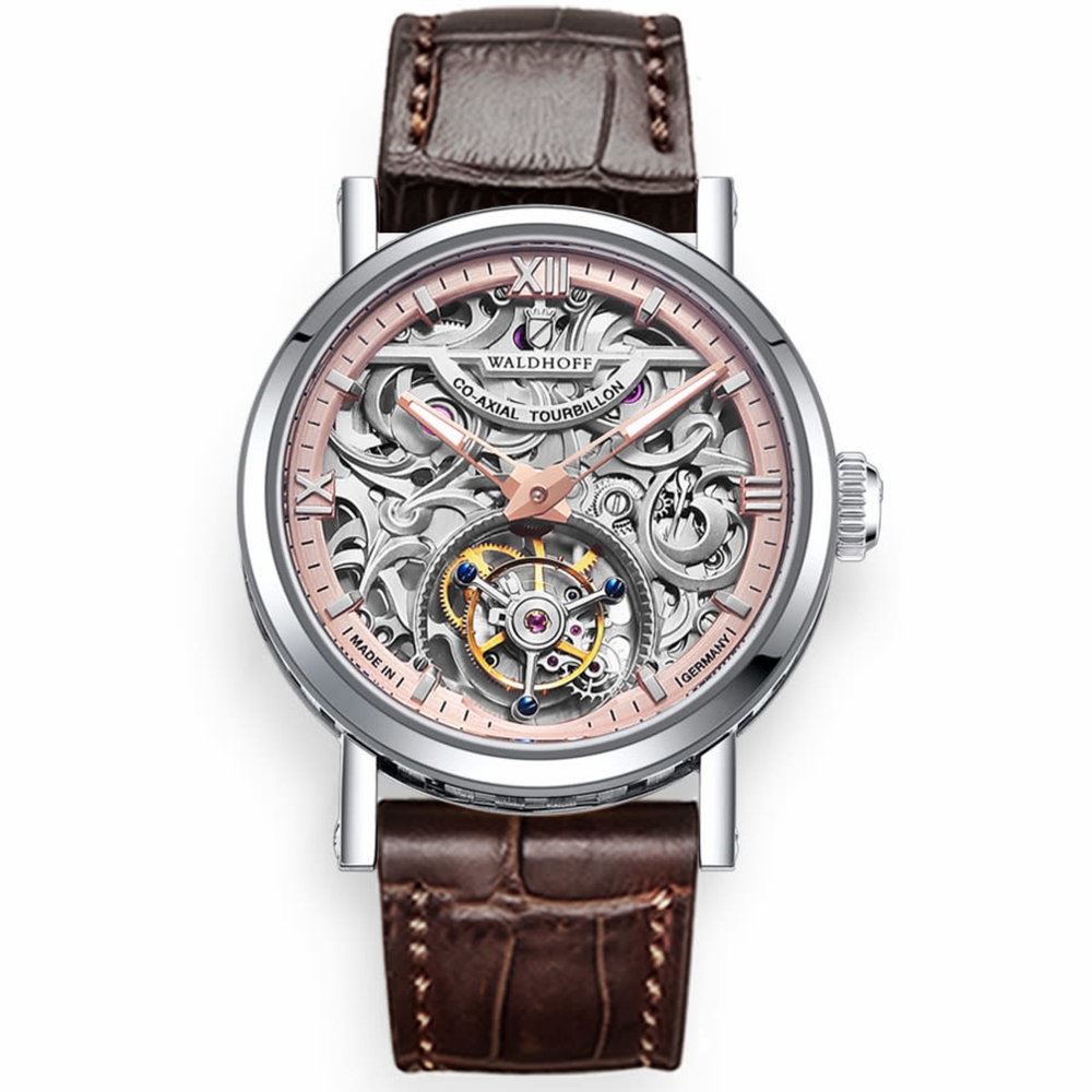 Silver-tone stainless steel case with a brown calfskin band. Fixed silver-tone stainless steel bezel. Silver-tone dial with rose gold-tone hands and Roman numeral & index hour markers. Minute markers around the outer rim. Dial Type: Analog. Luminescent hands. HZ 3452 Co-Axial Tourbillon hand wind movement. Scratch resistant sapphire crystal. Pull / push crown. Transparent case back. Round case shape, case size: 41 mm, case thickness: 11.5 mm. Band width: 22 mm. Deployment with push button release clasp. Water resistant at 30 meters / 100 feet. Functions: hour, minute, second, tourbillon. Metropolis Series. Luxury watch style. Waldhoff Metropolis Tourbillon Hand Wind Silver Dial Mens Watch Waldhoff Metropolis Red Gold.