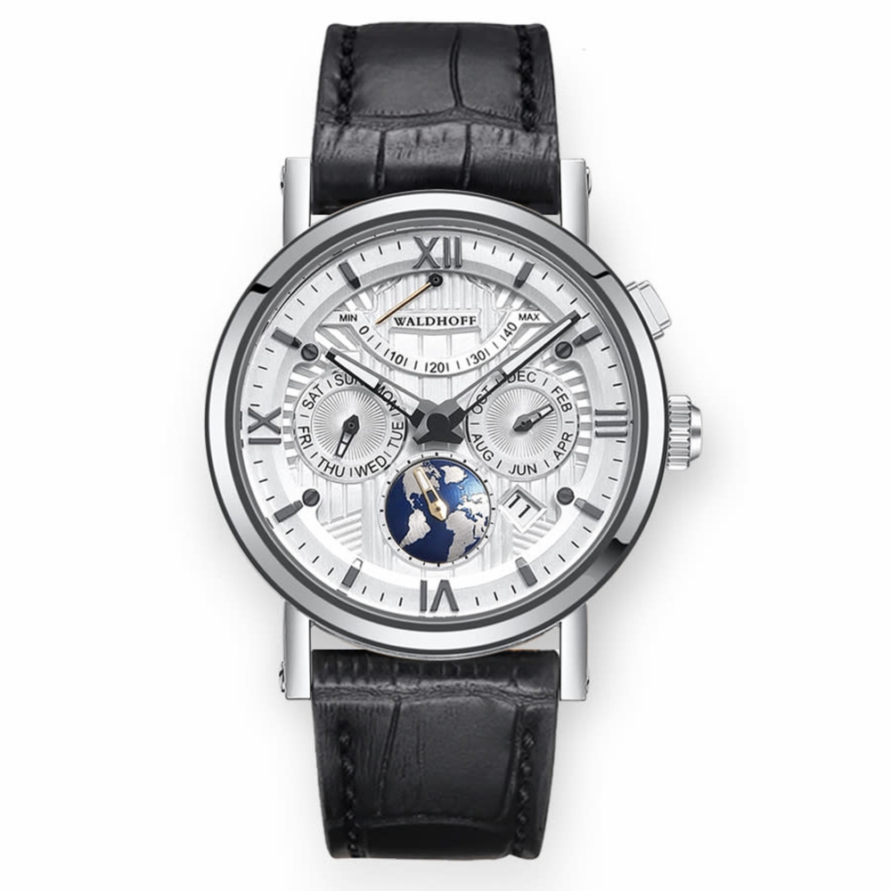Silver-tone stainless steel case with a black calfskin band. Fixed silver-tone stainless steel bezel. Silver-tone dial with black hands and Roman numeral & index hour markers. Minute markers around the outer rim. Dial Type: Analog. Luminescent hands. Day / date / month. 24 hour, power reserve subdials. Miyota caliber 9100 Automatic movement, containing 26 Jewels, bitting at 28800 vph, and has a power reserve of approximately 40 hours. Scratch resistant sapphire crystal. Pull / push crown. Transparent case back. Round case shape, case size: 41 mm, case thickness: 11.4 mm. Band width: 22 mm. Buckle clasp. Water resistant at 30 meters / 100 feet. Functions: full calendar, month, date, day, GMT, second time zone, hour, minute, second, power reserve indicator. Multimatic II Series. Luxury watch style. Watch label: Japan Movt. Waldhoff Multimatic II Automatic Silver Dial Mens Watch Waldhoff Multimatic II Diamond Silver.