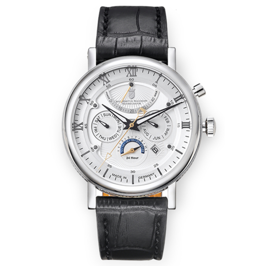 Stainless steel case with a black (calfskin) leather strap. Fixed stainless steel bezel. Silver dial with luminous black hands and Arabic numeral & index hour markers. Minute markers around the outer rim. Dial Type: Analog. Luminescent hands and markers. Date display between the 4 and 5 o'clock positions. Four sub-dials displaying: day of the week, date, 24 hour and power reserve. Miyota caliber 9100 automatic movement, containing 26 Jewels, bitting at 28800 vph, and has a power reserve of approximately 40 hours. Scratch resistant sapphire crystal. Pull / push crown. Transparent case back. Round case shape. Case size: 42.5 mm. Case thickness: 14 mm. Band width: 22 mm. Tang clasp. Water resistant at 50 meters / 165 feet. Functions: full calendar, month, date, day, GMT, second time zone, hour, minute, second, power reserve indicator. Multimatic Series. Dress watch style. Watch label: Made in Germany. Waldhoff Multimatic Automatic Silver Dial Mens Watch 03A.