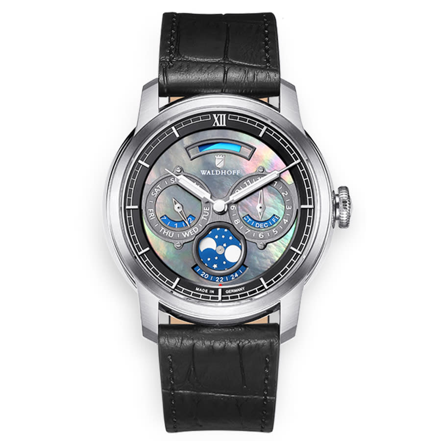Stainless steel case with a black (calfskin) leather strap. Fixed stainless steel bezel. Grey dial with luminous silver-tone hands and index hour markers. A Roman numeral appears at the 12 o'clock position. Minute markers around the outer rim. Dial Type: Analog. Luminescent hands and markers. Complete calendar. Three sub-dials displaying: day of the weelk (day), 12 hours (month) and moon phase (date). Power reserve indicator. Miyota caliber 9100 Automatic movement, containing 26 Jewels, bitting at 28800 vph, and has a power reserve of approximately 40 hours. Scratch resistant sapphire crystal. Pull / push crown. Transparent case back. Round case shape. Case size: 43 mm. Case thickness: 13.5 mm. Band width: 22 mm. Deployment clasp with a push button release . Water resistant at 30 meters / 100 feet. Functions: full calendar, month, date, day, GMT, second time zone, hour, minute, second, power reserve indicator. Olympus Series. Dress watch style. Watch label: Made in Germany. Waldhoff Olympus Automatic Grey Dial Mens Watch Olympus Carbon Silver.
