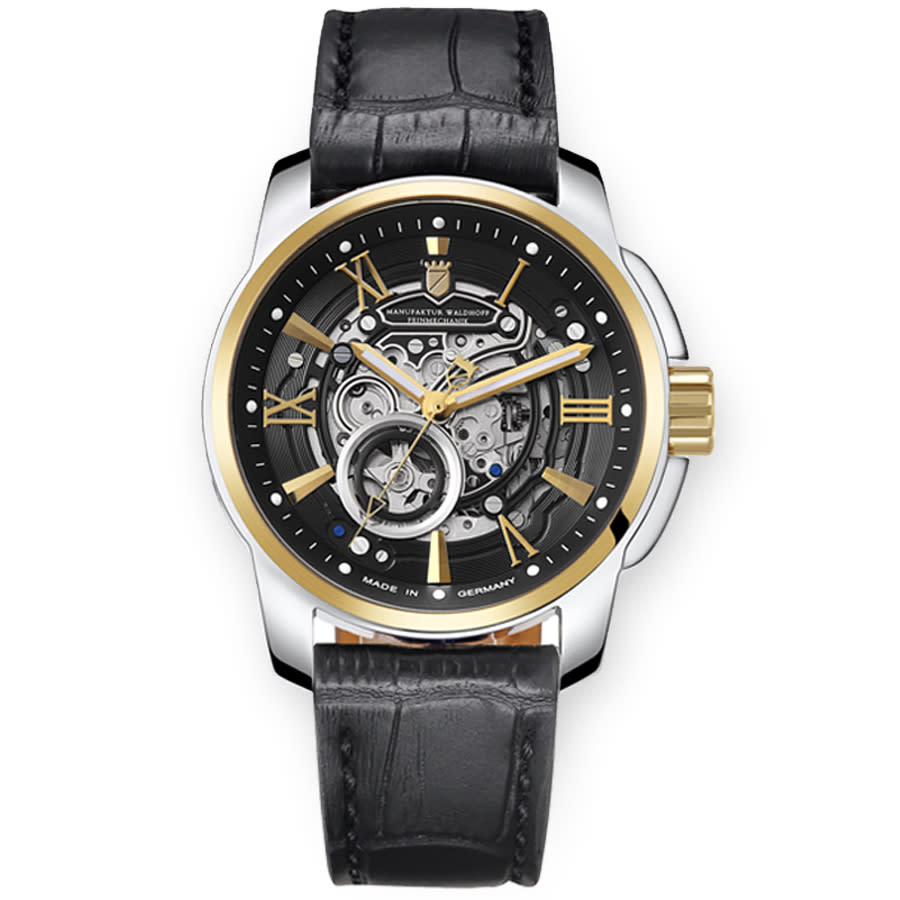 Silver-tone stainless steel case with a black genuine leather strap. Fixed yellow gold-tone stainless steel bezel. Black dial with yellow gold-tone hands and Arabic numeral & index hour markers. Minute markers around the outer rim. Dial Type: Analog. Luminescent hands and markers. Miyota Caliber 82SO Automatic movement, containing 21 Jewels, bitting at 21600 vph, and has a power reserve of approximately 42 hours. Scratch resistant sapphire crystal. Screw down crown. Transparent case back. Round case shape, case size: 42 mm, case thickness: 13.8 mm. Band width: 22 mm. Water resistant at 50 meters / 165 feet. Functions: hour, minute, second. Republic Gold Series. Casual watch style. Watch label: Japan Movt. Waldhoff Republic Gold Automatic Black Dial Mens Watch 04E.