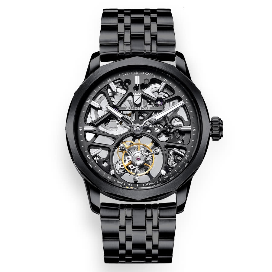 Black-plated stainless steel case and bracelet. Fixed black-plated bezel. Black (cut-out) dial with luminous silver-tone hands and index hour markers. Arabic numeral minute markers (at 5 minute intervals). Minute markers around the outer rim. Dial Type: Analog. Luminescent hands and markers. Hangzhou Calibre 3450A Tourbillon Hand Wind movement, containing 25 Jewels, bitting at 28800 vph, and has a power reserve of approximately 80 hours. Scratch resistant sapphire crystal. Pull / push crown. Transparent case back. Round case shape. Case size: 43 mm. Case thickness: 11.5 mm. Band width: 22 mm. Hidden fold over clasp. Water resistant at 30 meters / 100 feet. Functions: hour, minute, second. Vanguard V8 Series. Dress watch style. Watch label: Made In Germany. Waldhoff Vanguard V8 Hand Wind Black Dial Mens Watch Vanguard V8 Black 09E.