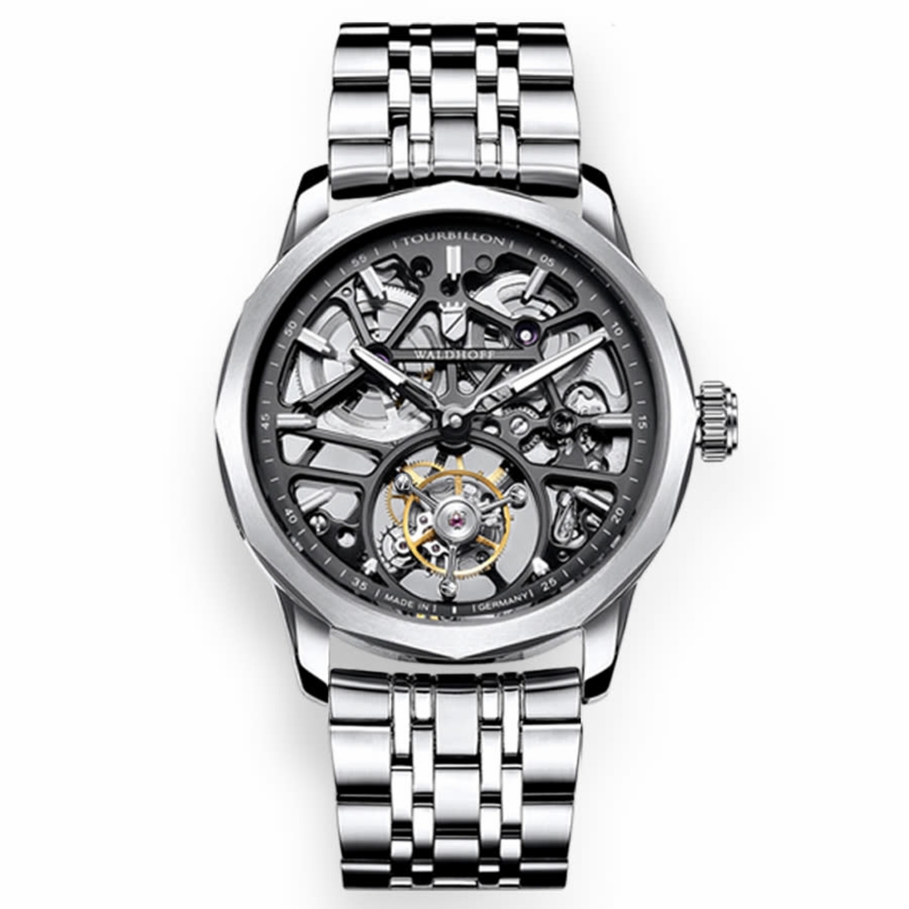 Silver-tone stainless steel case and bracelet. Fixed silver-tone stainless steel bezel. Gunmetal dial with black hands and index hour markers. Minute markers around the outer rim. Dial Type: Analog. Luminescent hands and markers. HZ 3450A Tourbillon hand wind movement. Scratch resistant sapphire crystal. Pull / push crown. Transparent case back. Round case shape, case size: 42 mm, case thickness: 11.5 mm. Band width: 21 mm. Hidden clasp. Water resistant at 30 meters / 100 feet. Functions: hour, minute, second, tourbillon. Vanguard V8 Series. Luxury watch style. Waldhoff Vanguard V8 Gunmetal Dial Mens Watch MW-09B.