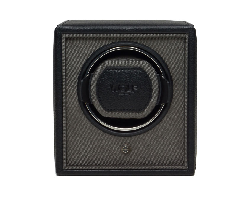 The Cub Winders are a user-friendly, travel-ready winder. The Module 1.8 is pre-programmed at 900 turns per day rotating bi-directionally. Additionally, these winders can be stored in custom cubbies and can be stacked to create a larger modular unit. Dimensions: 5"w x 4.5"d x 5.75"h. Works on either 3v ac power adapter (included) or d-cell battery. Black faux leather exterior and gray dobby twill interior. Large, lock-in cuff to accommodate larger, heavier watches.