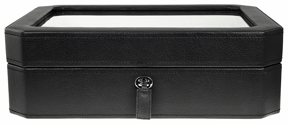 This black watch storage box holds up to 10 quartz or mechanical watches, and is portable enough for home or away. Holds up to 10 watches and, with 1.5" (55mm) between each cuff, this compact yet spacious case can accommodate any size watch - even the largest 52mm case . Handcrafted supple pebble finish textured material (outside). Wood construction. Ten removable pillows. Silver textured silk lining. Tempered glass lid. Polished chrome lock and key. Dimensions: 12.25"w x 9.5"d x 4"h.