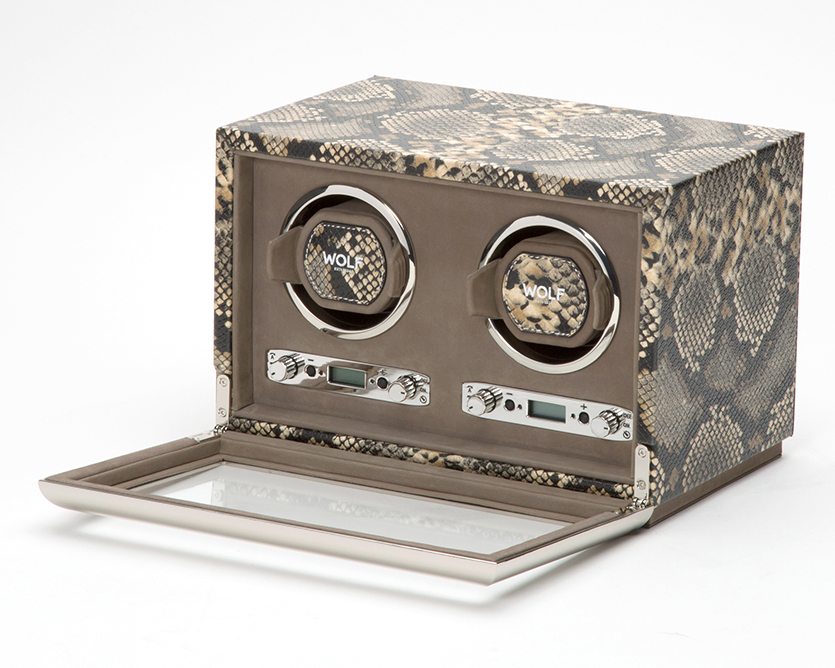 Exhibiting WOLF's wild side, the Exotic Collection of Watch Winders embody elegance and ferocity. This 2.7 module double winder is meticulously hand-crafted of tan python-embossed top grain leather. Access to the winder is through a sleek chrome plated door and the lining is a mink nubuck leather. Timepieces are held securely in place with the WOLF patented lock-in cuff. Dimensions: 7.75'W X 10.75'D X 7.25'H Features: Rotation Options: Can be set between 300 and 1200 TPD (turns per day). Double the amount of TPD by selecting bi-directional