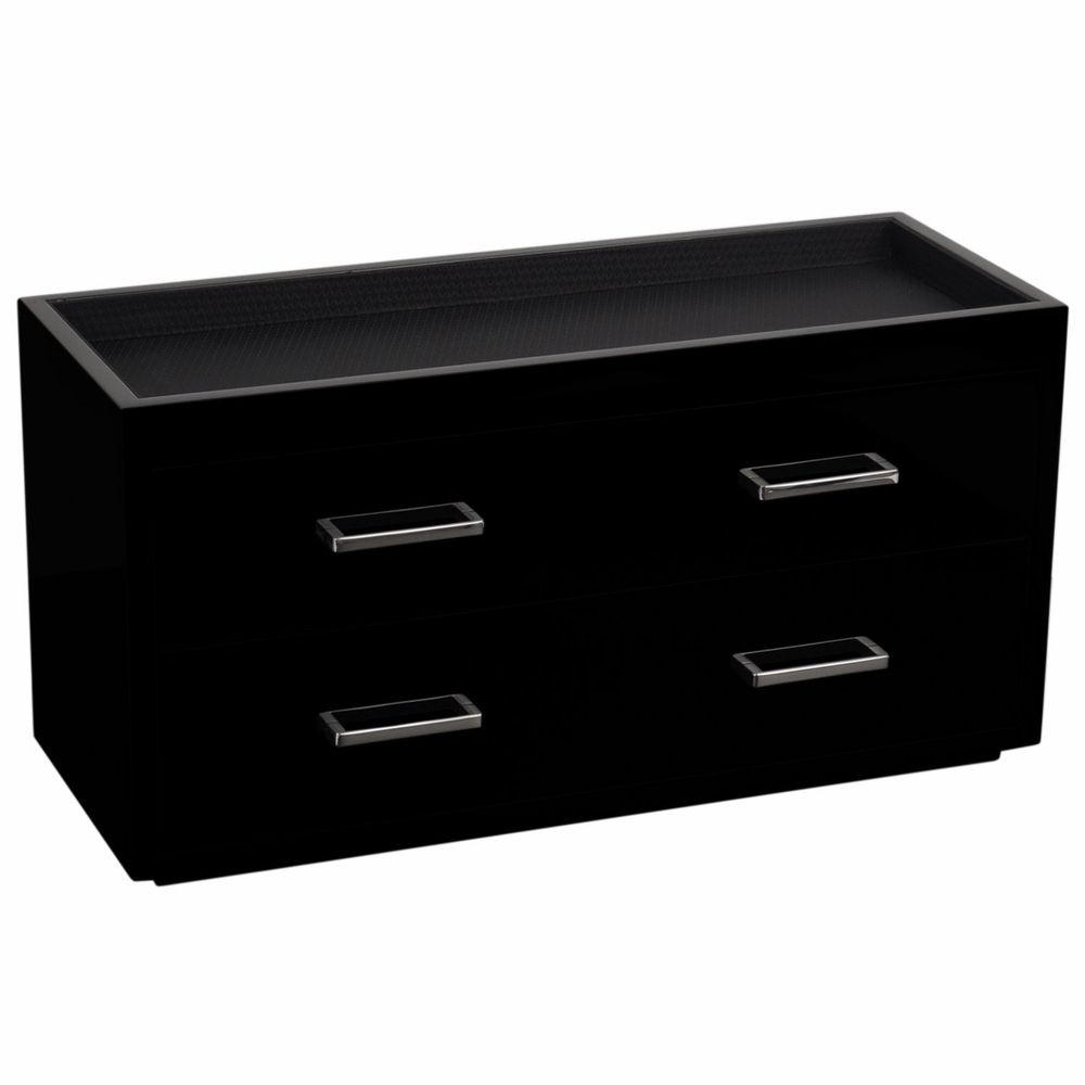 A Meridian handcrafted valet, charging station and pen box, in black, incorporates the ability to completely customize your accessory storage through a unique modular system. Includes chrome finished hardware, pen storage (up to 48 pens), high gloss finish, wooden frame, charging station (power strip not included) and valet compartment. The top drawer for charging devices (cable hole at the back. Power strip not included) and bottom drawer holds up to 24 pens. Material: Wooden frame. Meridian Two Drawer Valet Charging Station and Pen Box 460370