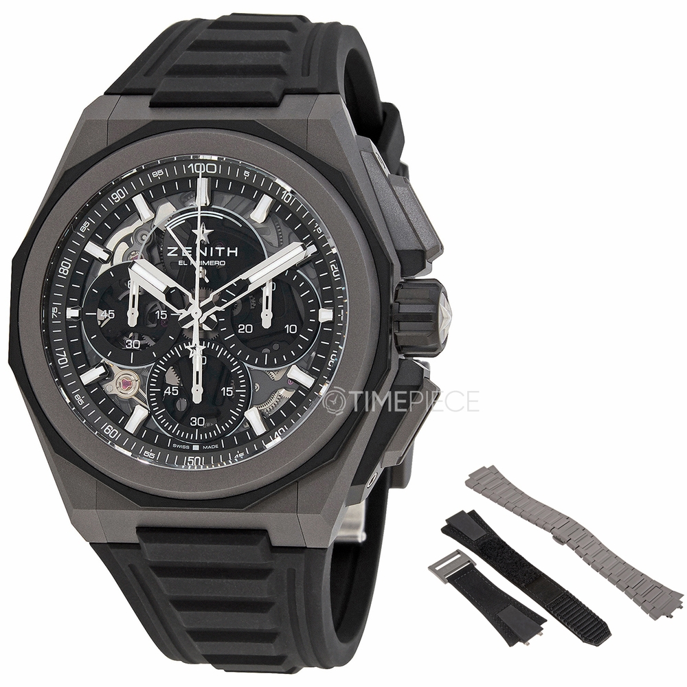 Grey (microblasted) titanium case and bracelet. Fixed grey (microblasted) titanium bezel. Skeleton dial with luminous silver-tone hands and index hour markers. Minute markers. 1/100th second markers around the outer rim. Dial Type: Analog. Luminescent hands and markers. Chronograph - three sub-dials displaying: 30 minutes, 60 seconds and small seconds. Zenith calibre El Primero 9004 automatic movement, containing 53 Jewels, bitting at 36000 vph, and has a power reserve of approximately 50 hours. Scratch resistant sapphire crystal. Screw down crown. Transparent case back. Round case shape. Case size: 45 mm. Case thickness: 15.4 mm. Band width: 28 mm. Fold over clasp. Water resistant at 200 meters / 660 feet. Functions: chronograph, hour, minute, second, power reserve. Additional Info: original box, manual (complete accessories). Defy Series. Luxury watch style. Watch label: Swiss Made. Zenith Defy Chronograph Automatic Mens Watch 97.9100.9004/02.I001.