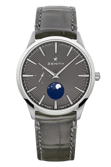Stainless steel case with a grey (alligator) leather strap. Fixed stainless steel bezel. Slate grey (sunray) dial with silver-tone hands and index hour markers. Minute markers around the outer rim. Dial Type: Analog. Small seconds sub-dial at the 9 o'clock position. Moonphase display. Elite 692 automatic movement with a 50-hour power reserve. Scratch resistant sapphire crystal. Pull / push crown. Solid case back. Round case shape. Case size: 40 mm. Case thickness: 9.35 mm. Band width: 20 mm. Tang clasp. Water resistant at 50 meters / 165 feet. Functions: hour, minute, second, moonphase. Elite Series. Luxury watch style. Watch label: Swiss Made. Zenith Elite Moonphase Automatic Grey Dial Mens Watch 03.3100.692/03.C923.