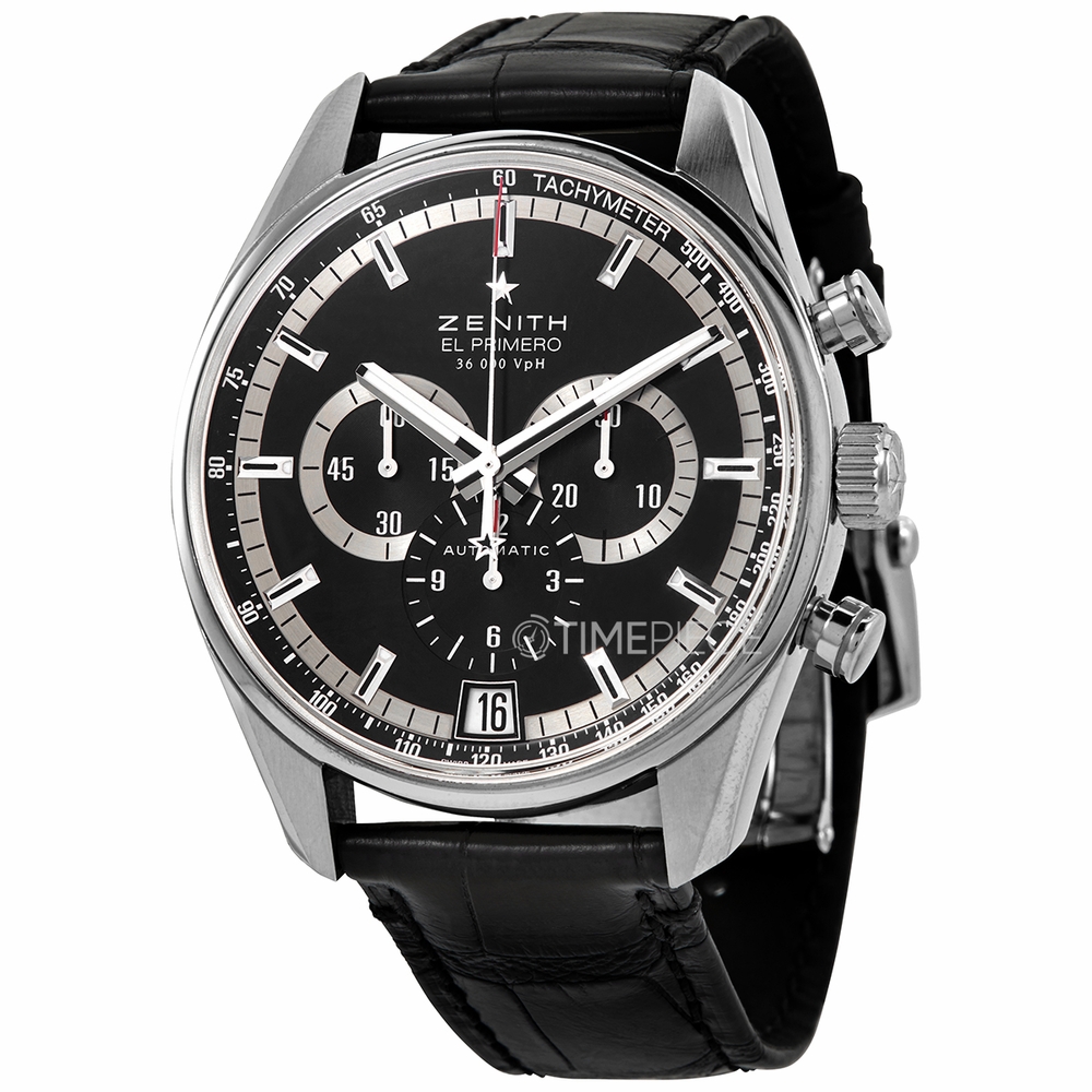 Stainless steel case with a black (alligator) leather strap. Fixed stainless steel bezel. Black dial with luminous silver-tone hands and index hour markers. Minute markers. Tachymeter around the outer rim. Dial Type: Analog. Luminescent hands and dial markers. Date display at the 6 o'clock position. Chronograph - three sub-dials displaying: 60 second, 30 minute and 12 hour. Zenith calibre El Primero 400B automatic movement, based upon Zenith El Primero 400, containing 31 Jewels, composed of 328 parts, bitting at 36000 vph, and has a power reserve of approximately 50 hours. Scratch resistant anti-reflective sapphire crystal. Pull / push crown. Transparent case back. Round case shape. Case size: 42 mm. Case thickness: 12.75 mm. Band width: 20 mm. Band length: 8.5 inches. Tang clasp. Water resistant at 100 meters / 330 feet. Functions: chronograph, tachymeter, date, hour, minute, second. El Primero Series. Luxury watch style. Watch label: Swiss Made. Item Variations: 03 2040 400/21 C496, 03-2040-400/21-C496, 03/2040/400/21/C496, 032040400/21C496. Zenith 36000 Black Dial Black Leather VPH Mens Watch 03.2040.400-21.C496.