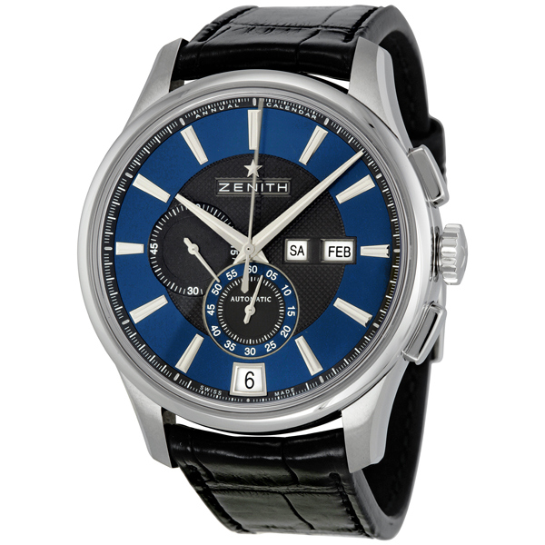 Silver-tone stainless steel case with a black (alligator) leather strap. Fixed silver-tone stainless steel bezel. Blue and black dial with luminous silver-tone hands and index hour markers. Minute markers around the outer rim. Dial Type: Analog. Luminescent markers. Date display at the 6 o'clock position. day of the week and month display at the 3 o'clock position. Chronograph - two sub-dials displaying: 60 second and 60 minute. Zenith Calibre El Primero 4054 Automatic movement, based upon Zenith El Primero 400, containing 341 Jewels, bitting at 36000 vph, and has a power reserve of approximately 50 hours. Scratch resistant anti-reflective sapphire crystal. Pull / push crown. Skeleton case back. Round case shape, case size: 42 mm, case thickness: 14 mm. Band width: 20 mm, band length: 8.5 inches. Tang clasp. Water resistant at 50 meters / 165 feet. Functions: annual calendar, chronograph, column wheel, month, date, day, hour, minute, small second. Captain Winsor Chronograph Series. Luxury watch style. Watch label: Swiss Made. Zenith Captain Winsor Automatic Chronograph Black and Blue Dial Mens Watch 032070405422C708.