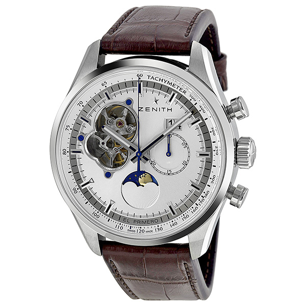 Stainless steel case with a brown leather strap. Uni-directional rotating stainless steel bezel. Silver dial (with a skeletal window) with luminous silver-tone hands and index hour markers. Minute markers. Tachymeter around the outer rim. Dial Type: Analog. Date display at the 2 o'clock position. Seconds sub-dial at the 3 o'clock position. Day/night indicator display. Automatic movement with a 50 hour power reserve. Scratch resistant sapphire crystal. Fluted crown. Skeleton case back. Case diameter: 45 mm. Case thickness: 16.75 mm. Round case shape. Band width: 17.5 mm - 22 mm. Band length: 8.5 inches. Deployment clasp. Water resistant at 30 meters / 100 feet. Functions: date, hour, minute, second, tachymeter. Luxury watch style. Watch label: Swiss Made. Zenith Chronomaster Open Grande Date Moonphase Mens Watch 032160404701C713.