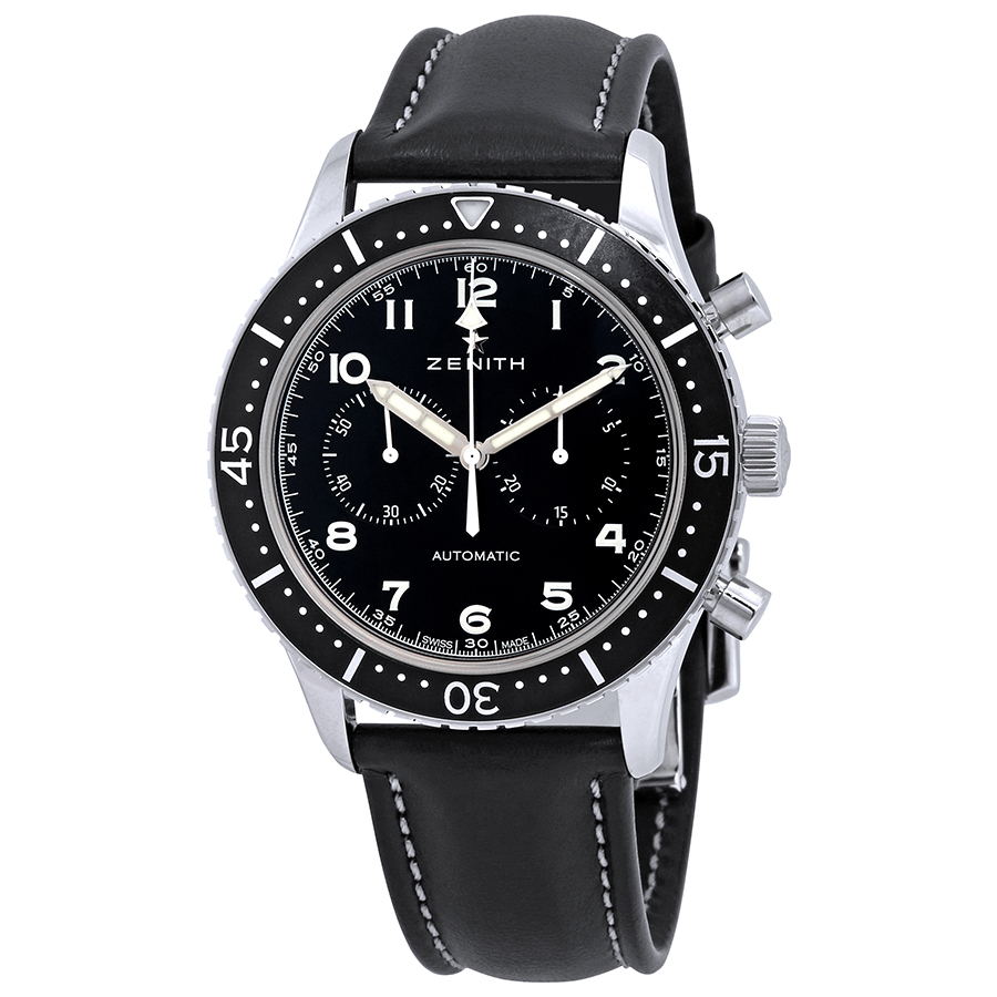 Silver-tone stainless steel case with a black leather strap. Uni-directional rotating coin edge stainless steel bezel with a black count-up elapsed time top ring. Black dial with silver-tone spade-shaped hands and Arabic numeral hour markers. Minute markers around the outer rim. Dial Type: Analog. Luminescent hands and markers. Chronograph - three sub-dials displaying: 60 second, 30 minute and 1/10th of a second. Zenith El Primero Calibre 4069 Automatic movement, containing 31 Jewels, composed of 254 parts, bitting at 36000 vph, and has a power reserve of approximately 50 hours. Scratch resistant sapphire crystal. Pull / push crown. Solid case back. Round case shape, case size: 43 mm, case thickness: 12.85 mm. Deployment clasp. Water resistant at 100 meters / 330 feet. Functions: chronograph, column wheel, hour, minute, small second. Pilot Series. Pilot watch style. Watch label: Swiss Made. Zenith Pilot Chronograph Automatic Black Dial Mens Watch 03.2240.4069/21.C774.
