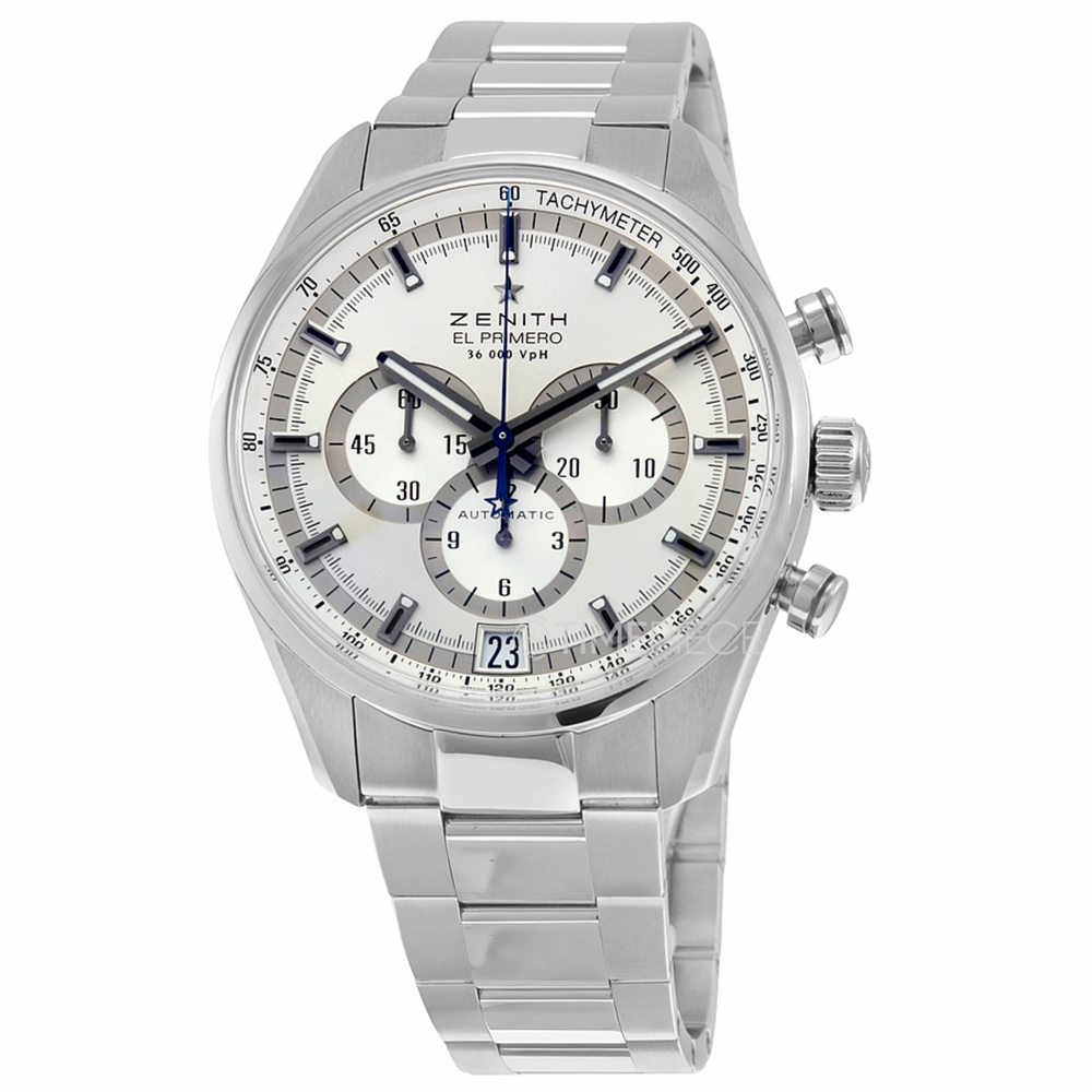 Stainless steel case with a stainless steel bracelet. Fixed stainless steel bezel. Silver dial with silver and blue-tone hands and index hour markers. Tachymeter and minute markers around the outer rim. Dial Type: Analog. Luminescent hands and markers. Date display at the 6 o'clock position. Chronograph - three sub-dials displaying: 60 second, 30 minute and 12 hour. Automatic movement. El Primero 400 B engine. Anti-reflective scratch resistant sapphire crystal. Push / pull crown. Transparent sapphire glass case back. Case diameter: 42 mm. Case thickness: 12.75 mm. Round case shape. Triple folding clasp. Water resistant at 100 meters / 330 feet. Functions: chronograph, date, hour, minute, second, tachymeter. Luxury watch style. Watch label: Swiss Made. Zenith El Primero Automatic Silver Dial Mens Watch 03.2040.400/04.M2040.