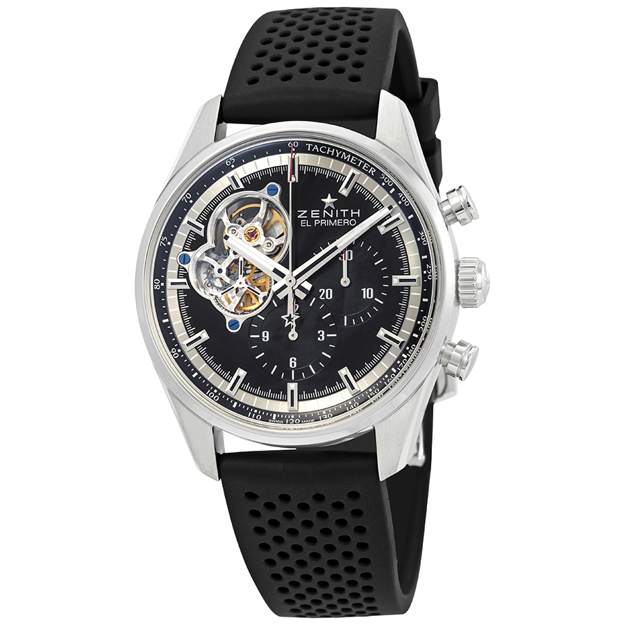 Silver-tone stainless steel case with a black rubber strap. Fixed silver-tone stainless steel bezel. Black (skeletal window) dial with silver-tone hands and index hour markers. Minute markers. tachymeter markings around the outer rim. Dial Type: Analog. Luminescent hands and markers. Chronograph - sub-dials displaying: two - 12 hour and 30 minute. Zenith Calibre El Primero 4061 Automatic movement, based upon Zenith El Primero 400, containing 31 Jewels, composed of 282 parts, bitting at 36000 vph, and has a power reserve of approximately 50 hours. Scratch resistant sapphire crystal. Pull / push crown. Transparent case back. Round case shape, case size: 42 mm, case thickness: 12.75 mm. Water resistant at 100 meters / 330 feet. Functions: chronograph, column wheel, hour, minute, small second. Luxury watch style. Watch label: Swiss Made. Zenith Chronomaster El Primero Mens Watch 03.2040.4061/21.R576.