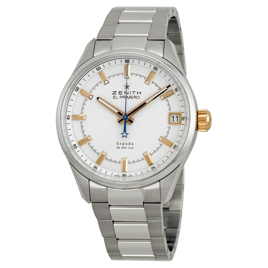 Stainless steel case with a stainless steel bracelet. Fixed stainless steel bezel. White dial with luminous rose gold hands and index hour markers. Minute markers around the outer rim. Dial Type: Analog. Luminescent hands and markers. Date display at the 3 o'clock position. Automatic movement with a 50 hour power reserve. Anti-reflectice scratch resistant sapphire crystal. Screw down crown. Solid case back. Case diameter: 40 mm. Case thickness: 11.70 mm. Round case shape. Fold over clasp with a double push button release. Water resistant at 100 meters / 330 feet. Functions: date, hour, minute, second. Additional Info: Case back engraved with a 5.0-gram 18kt rose gold medallion. Luxury watch style. Watch label: Swiss Made. Zenith El Primero Automatic White Dial Mens Watch 03.2171.4650/01.M2170.