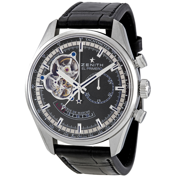 Stainless steel case with a black leather strap. Fixed stainless steel bezel. Black (skeletal wimdow) dial with silver-tone hands and stick hour markers. Minute markers. Tachymeter scale appears around the outer rim. Dial Type: Analog. Luminescent hands and markers. Two sub-dials displaying: small seconds and power reserve. Zenith calibre El Primero 4021 automatic movement with a 50-hour power reserve. Scratch resistant sapphire crystal. Pull / push crown. Skeleton case back. Case size: 42 mm. Case thickness: 14.50 mm. Round case shape. Band width: 21 mm. Triple folding clasp. Water resistant at 100 meters/ 330 feet. Functions: chronograph, hour, minute, second, power reserve. Luxury watch style. Watch label: Swiss Made. Zenith Chronomaster Open Power Reserve Automatic Mens Watch 032080402121C496.