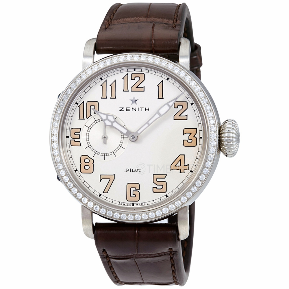 Stainless steel case with a brown alligator leather strap. Fixed stainless steel bezel set with diamonds. White dial with luminous hands and Arabic numeral hour markers. Minute markers around the outer rim. Dial Type: Analog. Luminescent hands and markers. Small seconds sub-dial. Zenith calibre Elite 681 automatic movement with a 50-hour power reserve. Scratch resistant sapphire crystal. Solid case back. Case size: 40 mm. Case thickness: 11.80 mm. Round case shape. Tang clasp. Water resistant at 100 meters / 330 feet. Functions: hour, minute, second. Luxury watch style. Watch label: Swiss Made. Item Variations: 16 1930 681/31 C725, 16-1930-681/31-C725, 16/1930/681/31/C725, 161930681/31C725. Zenith Pilot Montre dAeronef Automatic Ladies Watch 16193068131C725.