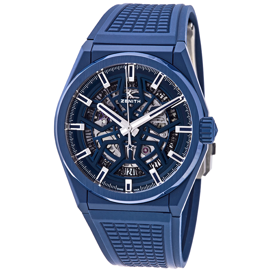 Blue ceramic case with a blue rubber strap. Blue ceramic bezel. Blue skeleton dial with silver-tone hands and index hour markers. Dial Type: Analog. Date display at the 6 o'clock position. Zenith Calibre Elite 670 SK automatic movement with a 50-hour power reserve. Scratch resistant sapphire crystal. Transparent case back. Round case shape. Case size: 41 mm. Double folding clasp. Water resistant at 100 meters / 330 feet. Functions: date, hour, minute, second. Luxury watch style. Watch label: Swiss Made. Zenith DEFY Classic Blue Skeleton Dial Automatic Mens Watch 49.9003.670/51.R793.