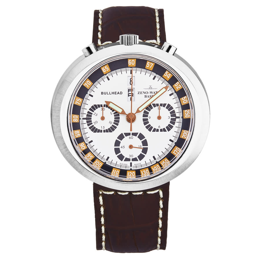 Silver-tone stainless steel case with a brown leather strap. Fixed silver-tone stainless steel bezel. White dial with gold-tone hands and index hour markers. Minute markers around the outer rim. Dial Type: Analog. Luminescent hands and markers. Date display at the 12 o'clock position. Chronograph - three sub-dials displaying: 60 second, 30 minute and 12 hour. Automatic movement. Scratch resistant sapphire crystal. Pull / push crown. Solid case back. Round case shape, case size: 46 mm, case thickness: 15 mm. Band width: 22 mm, band length: 8 inches. Buckle clasp. Water resistant at 30 meters / 100 feet. Functions: chronograph, date, hour, minute, second. Additional Info: hour, minute, second, day, date, chronograph. Bullhead Series. Luxury watch style. Watch label: Swiss Made. Zeno Bullhead Chronograph Automatic White Dial Mens Watch 3591-I26.