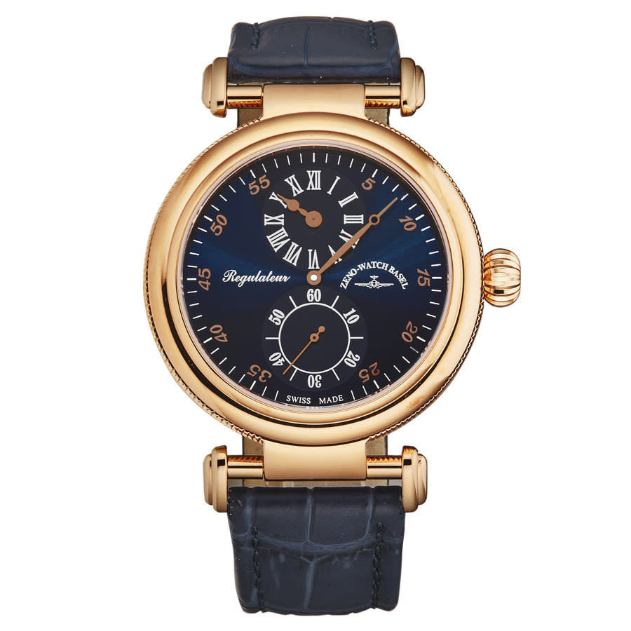 Rose gold-tone stainless steel case with a blue leather strap. Fixed rose gold-tone bezel. Blue dial with rose gold-tone hands and index hour markers. Arabic numeral minute markers (at 5 minute intervals). Minute markers around the outer rim. Dial Type: Analog. Chronograph - two sub-dials displaying: 60 seconds and 12 hours. Automatic movement. Scratch resistant sapphire crystal. Pull / push crown. Transparent case back. Round case shape. Case size: 43 mm. Case thickness: 11 mm. Band width: 20 mm. Band length: 8 inches. Tang clasp. Water resistant at 300 meters / 1000 feet. Functions: chronograph, hour, minute, second. Jaquetregitr Series. Luxury watch style. Watch label: Swiss Made. Zeno JaquetRegitr Chronograph Automatic Blue Dial Mens Watch 1781F-PGR-H4.