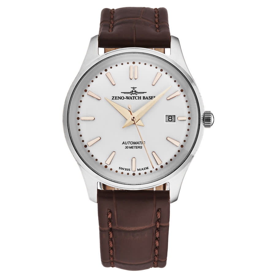 Silver-tone stainless steel case with a brown leather strap. Fixed silver-tone stainless steel bezel. White dial with gold-tone hands and index hour markers. Minute markers around the outer rim. Dial Type: Analog. Date display at the 3 o'clock position. Automatic movement. Scratch resistant acrylic crystal. Pull / push crown. Solid case back. Round case shape, case size: 40 mm, case thickness: 12.5 mm. Band width: 20 mm, band length: 8 inches. Buckle clasp. Water resistant at 30 meters / 100 feet. Functions: date, hour, minute, second. Jules Classic Series. Luxury watch style. Watch label: Swiss Made. Zeno Jules Classic Automatic White Dial Mens Watch 4942-2824-G2.
