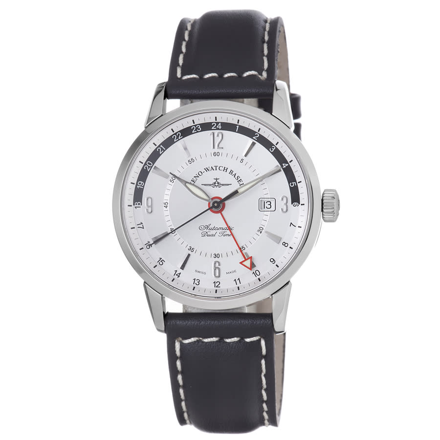 Stainless steel case with a black leather strap. Fixed stainless steel bezel. Silver-tone dial with luminous silver-tone hands and index hour markers. Arabic numerals appear at the 3, 6, 9 and 12 o'clock positions. 24 hour markers, minute markers around the outer rim. Dial Type: Analog. Luminescent hands. Date display at the 3 o'clock position. Automatic movement. Scratch resistant sapphire crystal. Pull / push crown. Transparent case back. Round case shape. case size: 42 mm. Case thickness: 14 mm. Band width: 22 mm. band length: 8 inches. Tang clasp. Water resistant at 50 meters / 165 feet. Functions: GMT, second time zone, date, hour, minute, second. Magellano Series. Luxury watch style. Watch label: Swiss Made. Zeno Magellano Automatic Silver Dial Mens Watch 6069GMT-G3.