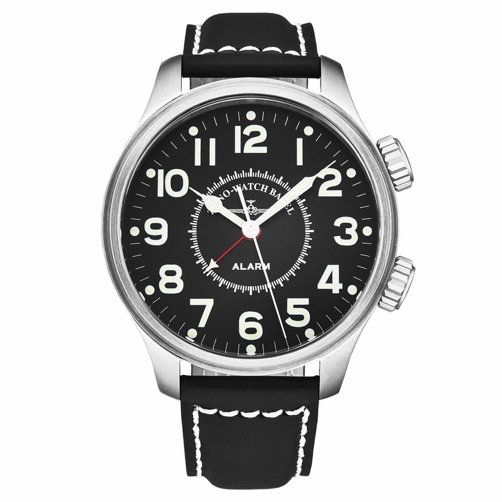 Stainless steel case with a black leather strap. Fixed stainless steel bezel. Black dial with luminous silver-tone hands and Arabic numeral hour markers. Minute markers around the outer rim. Dial Type: Analog. Luminescent hands and markers. Poljot 2612.1 hand wind movement. Scratch resistant mineral crystal. Pull / push crown. Solid case back. Round case shape. Case size: 47.5 mm. Case thickness: 14.5 mm. Band width: 22 mm. Band length: 8 inches. Tang clasp. Water resistant at 100 meters / 330 feet. Functions: hour, minute, second. Additional Info: hours, minutes, seconds, alarm. Os Pilot Series. Luxury watch style. Watch label: Swiss Made. Zeno OS Pilot Hand Wind Black Dial Mens Watch 8591-A1.